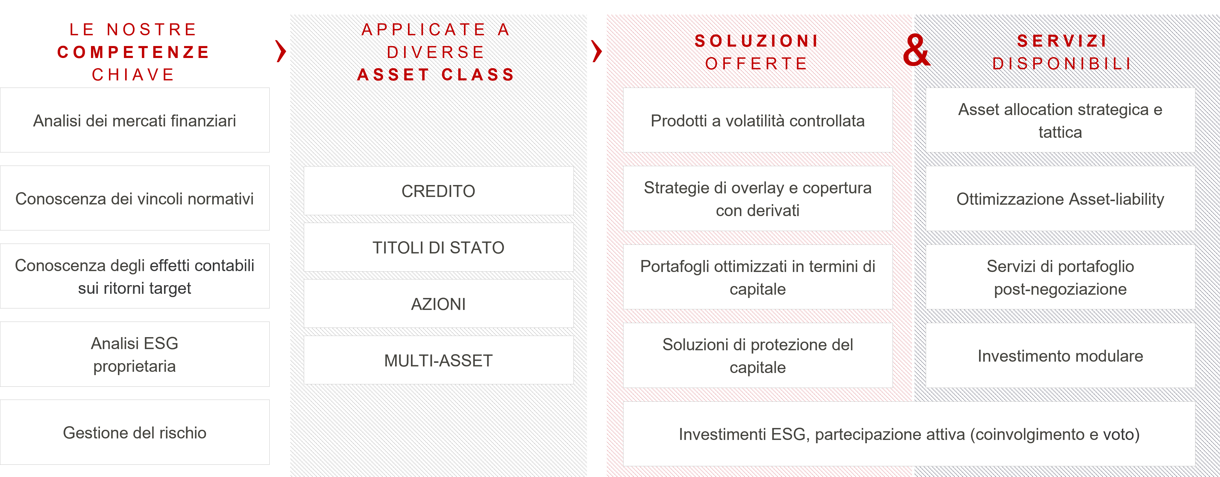 Facciamo leva sulle nostre capacità chiave per proporre servizi e soluzioni totalmente personalizzati in base alle sfide di investimento specifiche di ogni cliente.