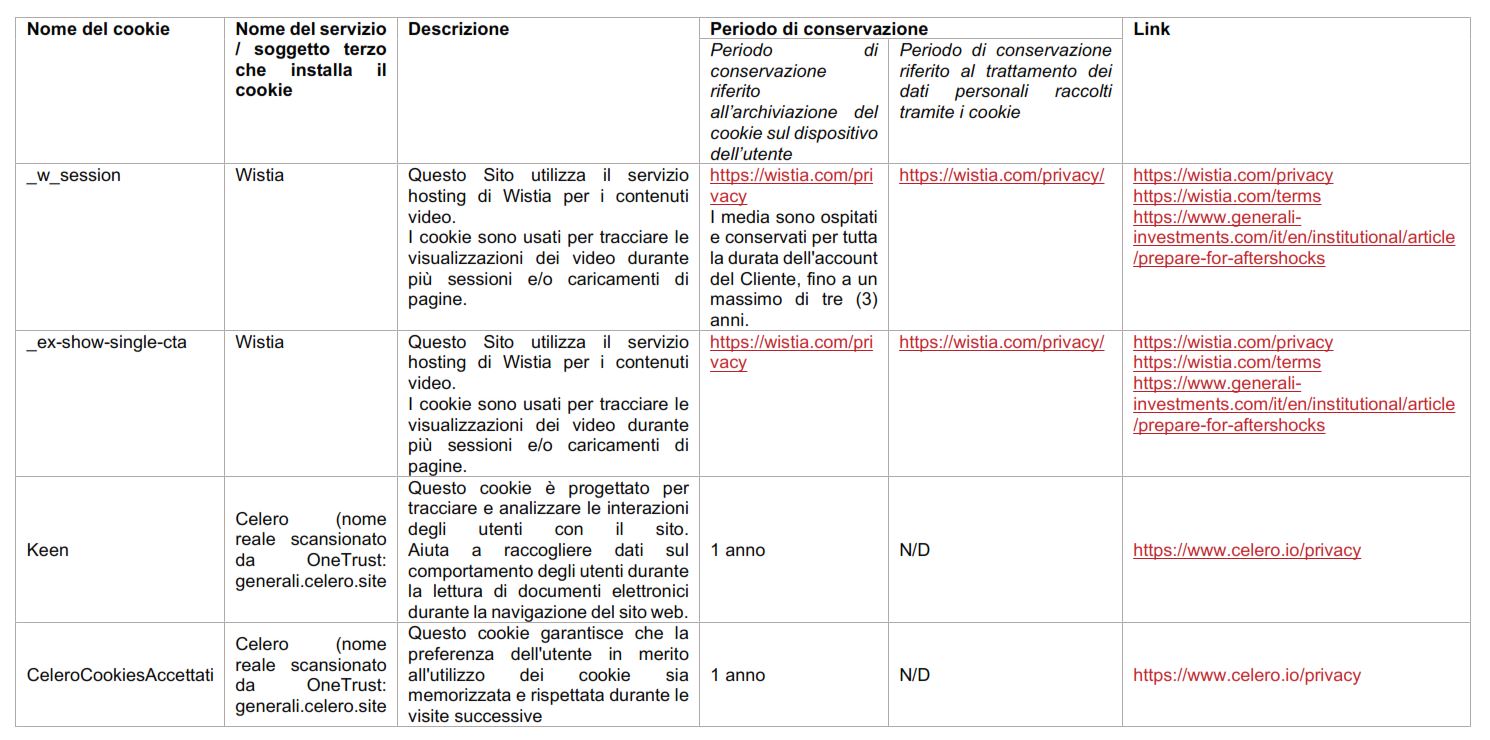 Salvo ove diversamente specificato, questa informativa sulla privacy non si applica né: (i) ad altre attività di trattamento di dati personali effettuate da Generali AM attraverso altri mezzi diversi dal Sito Web (ad es., informazioni raccolte offline), (ii) ad attività di trattamento effettuate da altre società del Gruppo Generali su siti web a cui potreste accedere tramite link presenti sul Sito Web. Per informazioni su come le altre società del Gruppo Generali trattano i dati personali attraverso i loro siti web, Vi preghiamo di fare riferimento alle rispettive informative sulla privacy ivi presenti.