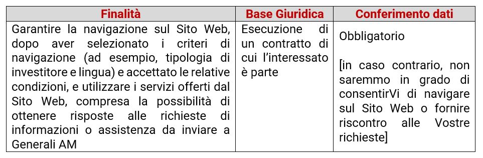 Generali AM elaborerà alcune informazioni a Voi riferibili esclusivamente per perseguire la finalità ed in forza della base giuridica di seguito indicate: