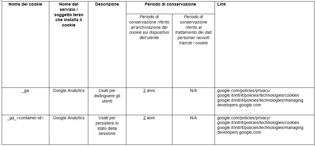 Di seguito è riportato un elenco dei cookie analitici attualmente impiegati dal Sito.